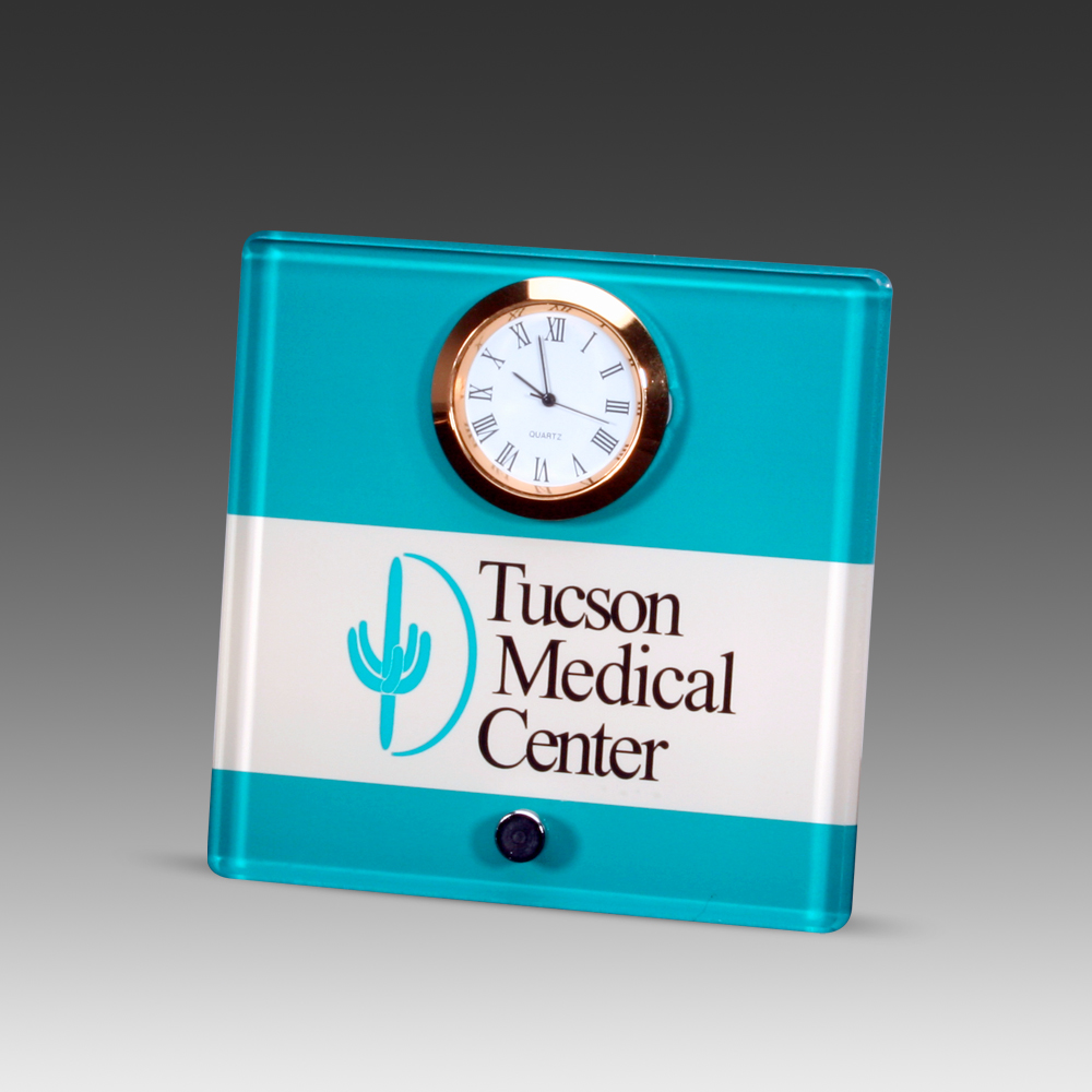 Combine clarity and style on this 4" x 4" clock, printed in vibrant full-color with hand-polished edges It includes a silver stand-up pin for easy display and a small round clock with a white dial, gold-tone frame, gold-tone hour, minute, and second hands, plus black Roman numeral hour markers for a classic touch. Perfect for adding elegance and function to any desk or shelf. Available in two sizes (APDCLK-4, APDCLK-6). All dimensions approximate. Pricing includes full-color, spot print or laser engraved imprint.