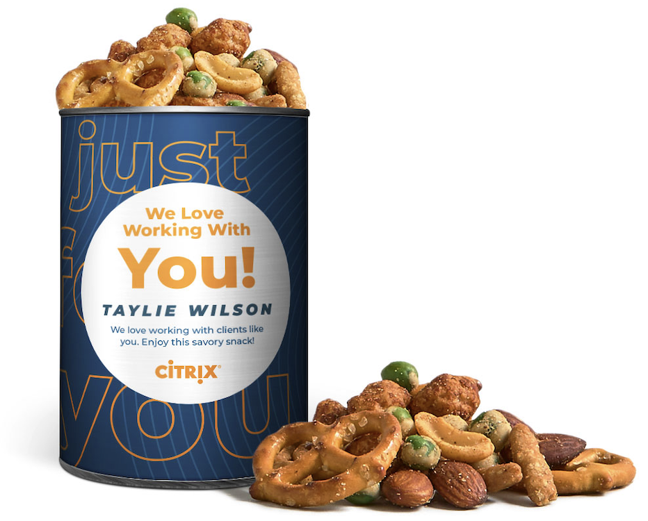 Sofia's 4-inch Custom Snack Mix & Nut Canisters combine savory gourmet flavors with fully customizable packaging that makes every gift memorable. Each canister is packed fresh in the USA and filled with premium mixes designed to satisfy every craving. Flavor options include sweet Butter Toffee Peanuts, energizing Fruit & Nut Mix, bold Spicy Guacamole Mix, and the unique East Meets West Mix. Perfect for birthdays, work anniversaries, new hire welcome kits, company events, conferences, edible giveaways, or thoughtful thank-you gifts, these gourmet canisters deliver both flavor and impact. With custom-designed packaging options, they're an ideal way to showcase your brand, message, or campaign while treating recipients to a high-quality, flavorful experience.